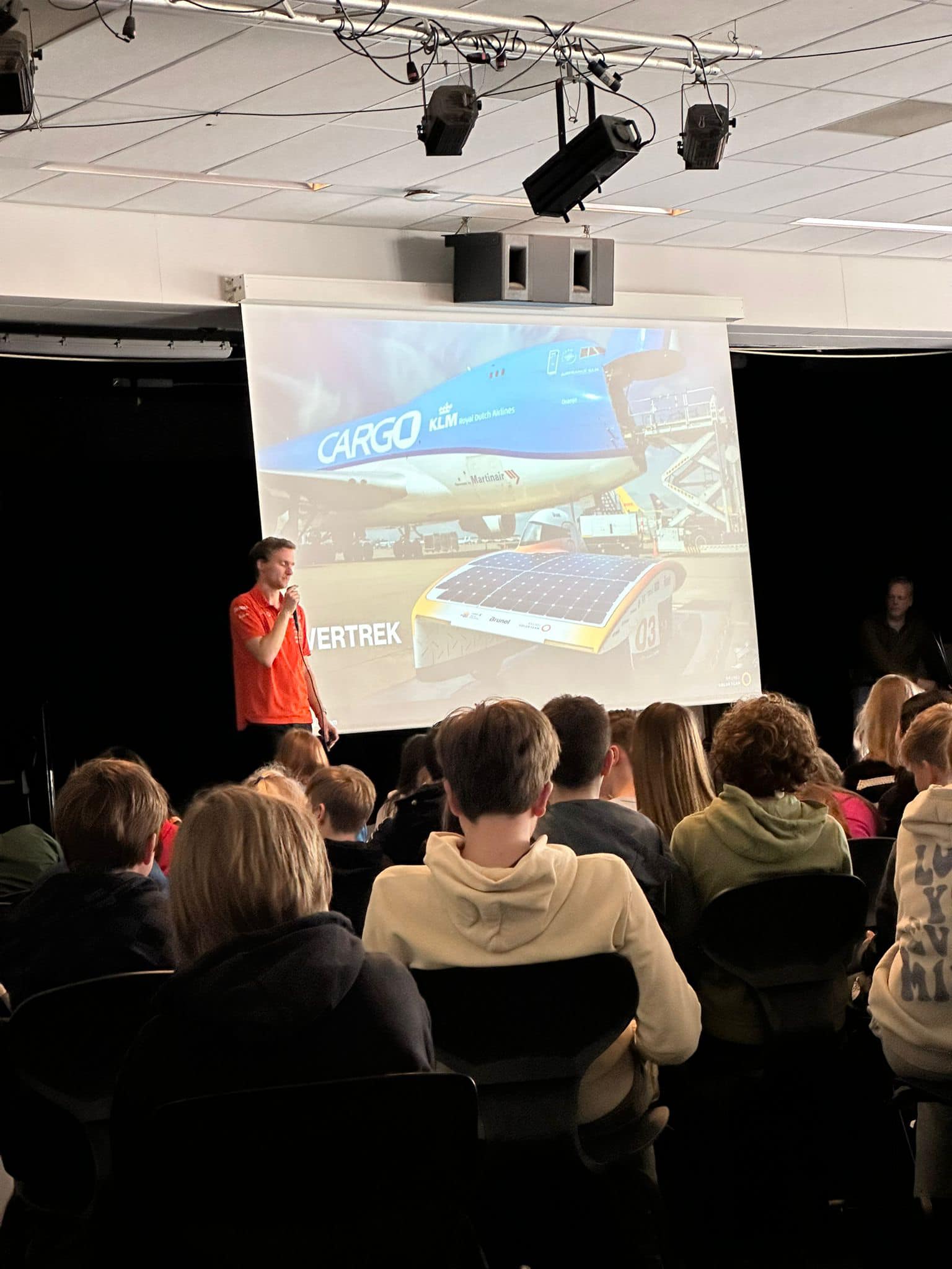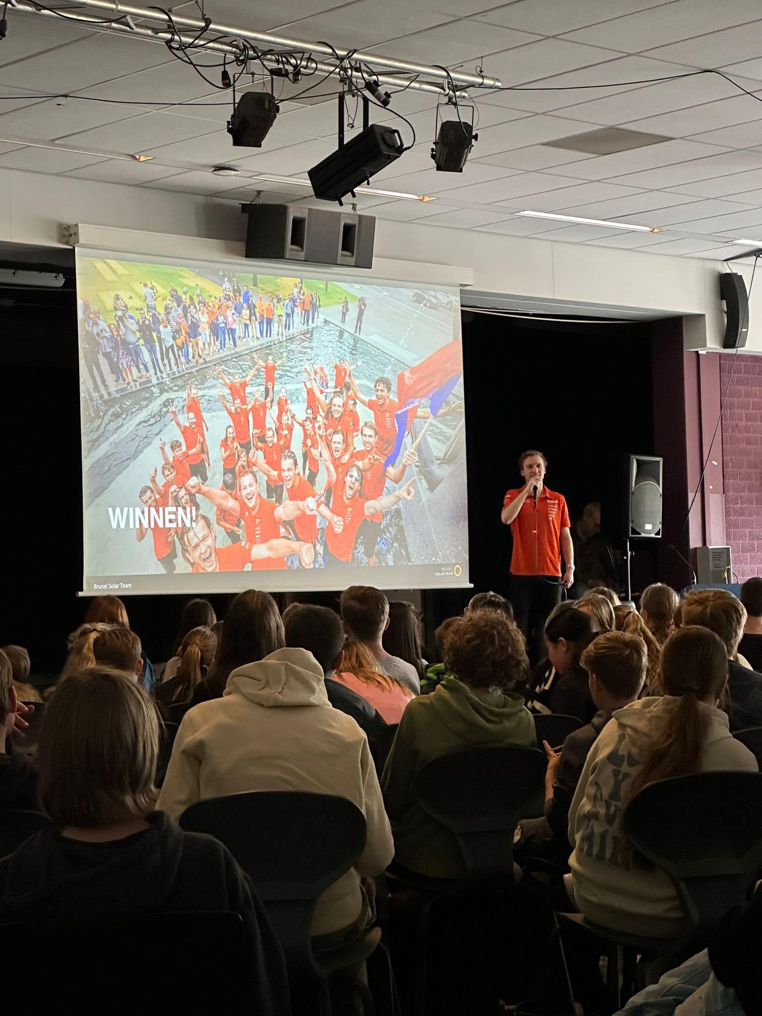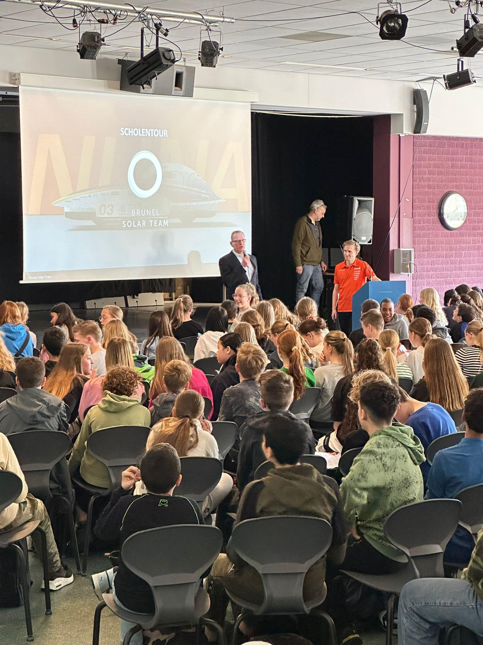 Het Brunel Solar Team van TU Delft was vandaag te gast. Ze namen ook de auto mee die aan de rally in Marokko en Zuidafrika heeft meegedaan. Stefan Loen, oud leerling van het JEL, gaf een presentatie. De aula zat helemaal vol met leerlingen van leerjaar 1 en 2.