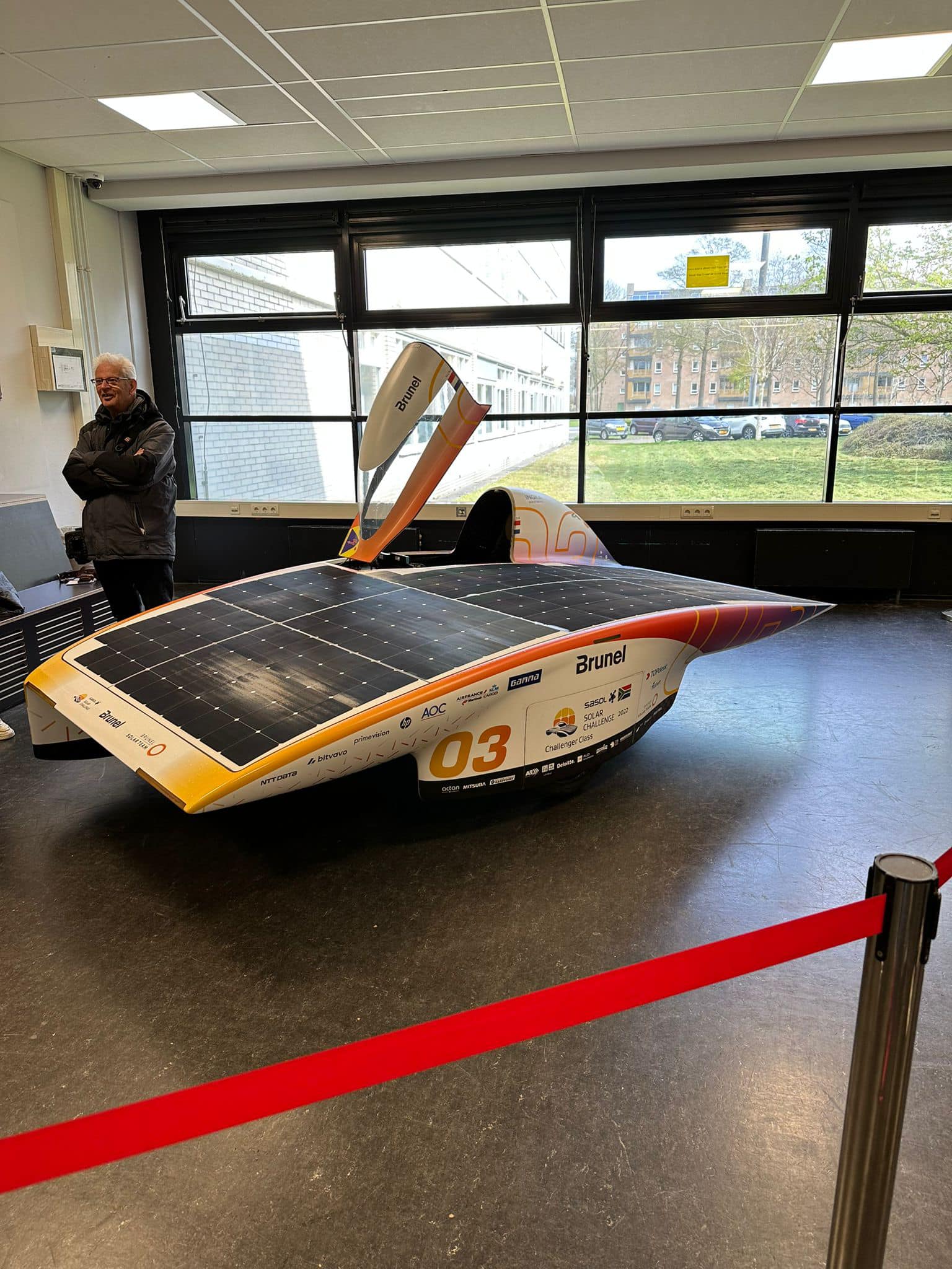 Het was nog een hele klus om de solar car in de kleine aula te krijgen.