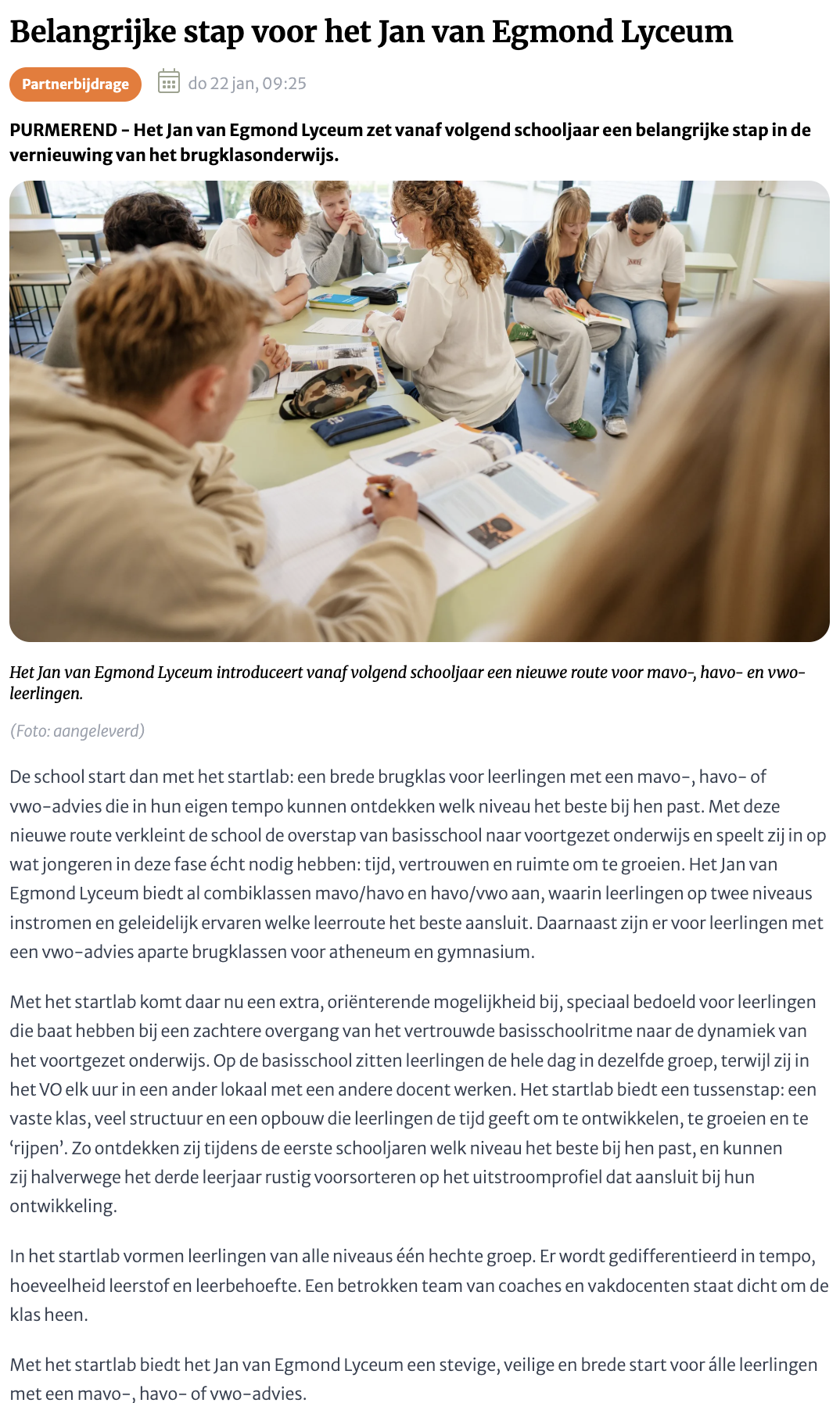 Het Jan van Egmond Lyceum start volgend schooljaar met een Startlab, een brede brugklas waarin leerlingen met mavo-, havo- of vwo-advies in hun eigen tempo kunnen ontdekken welk niveau het beste bij hen past. Zo krijgt iedereen een zachte en veilige overgang van de basisschool naar het voortgezet onderwijs.